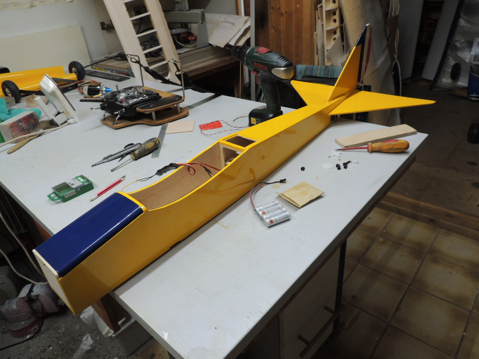 Leistung ist übertrieben viel vorhanden, was an den bereits vorhandenen Komponenten lag. Der schwere Akku liegt aber trotzdem zugunsten des Schwerpunktes weit hinten unter der Tragfläche. Vermutlich sorgt ein 4s-Antrieb bereits für einen knackigen Vortrieb.