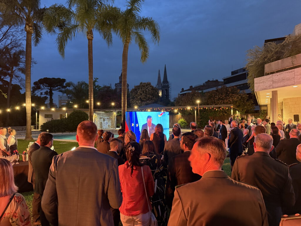 An der Deutschen Botschaft in Buenos Aires wird der deutsche Nationalfeiertag mit Verspätung begangen. Der Botschafter empfing auch in diesem Jahr viele Gäste im Botschaftsgebäude bei Häppchen, Currywurst, Getränken und Reden. Es durfte wie immer auch getanzt werden.