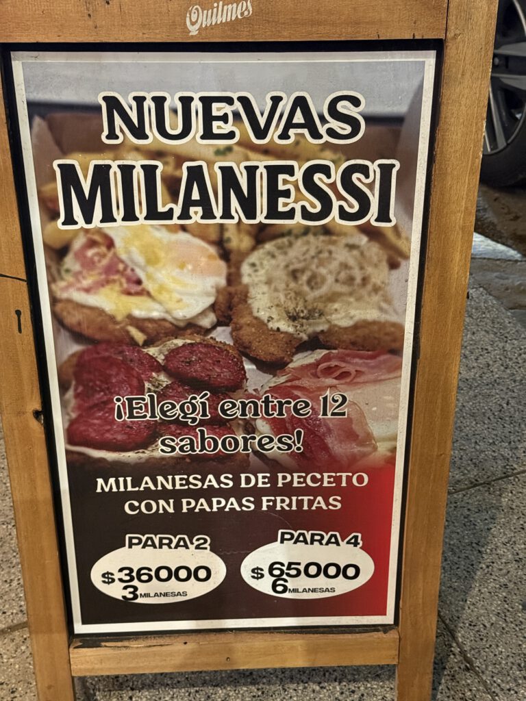 Auf dem Bild bewirbt ein Lokal seine Schnitzel, im Land Milanesas genannt, mit frechem Fußballbezug.